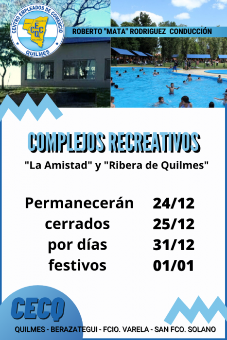 El Centro de Empleados de Comercio de Quilmes les informa que debido a los días festivos correspondientes, el Complejo recreativo «La Amistad» y «Ribera de Quilmes» permanecerán cerrados los días 24/12, 25/12, 31/12 y 01/01.