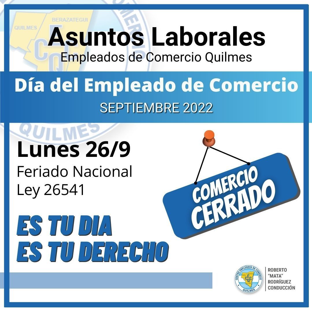 El 26 de Septiembre celebramos el día del Empleado de Comercio. Deseamos que todos puedan disfrutarlo y celebrarlo. Les recordamos que de acuerdo a lo establecido en la Ley 26.541, a dicho día se le aplicará el mismo régimen que a los feriados nacionales en todos los efectos legales.
