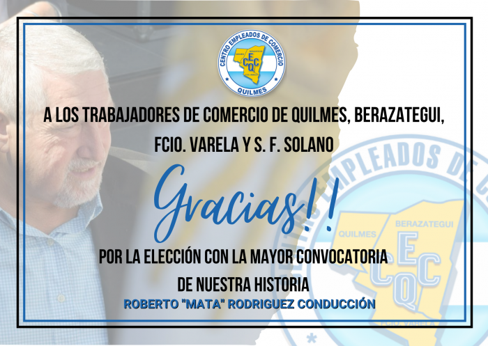 GRACIAS 27 diciembre, 202129 septiembre, 2021 por adminwp40 Gracias a los trabajadores de Comercio de Quilmes, Berazategui, Fcio. Varela y S. Fco. Solanopor la participación y el apoyo permanente.