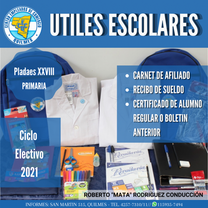 El Centro Empleado de Comercio Quilmes informa que se encuentra a disposición el kit de ayuda escolar para nuestros afiliados con hijos cursando la escolaridad primaria.