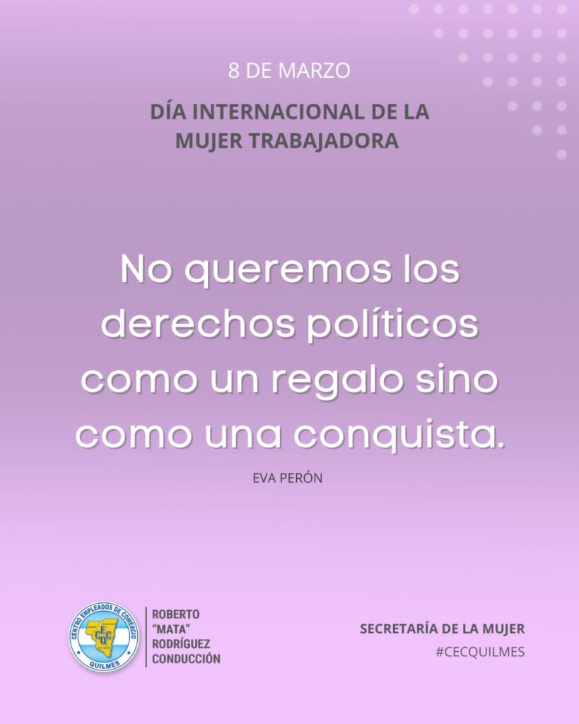 En reconocimiento a quienes sostienen la lucha por la igualdad y la justicia y en memoria de quienes dieron su vida por la causa, La Secretaria de la Mujer del Centro de Empleados de Comercio de Quilmes y su Secretario Gral. Roberto «Mata» Rodríguez saludan a las mujeres en su día y las arengan y acompañan en la reivindicación de la igualdad de género, el respeto a la diversidad y el rol fundamental de la mujer en la sociedad.
