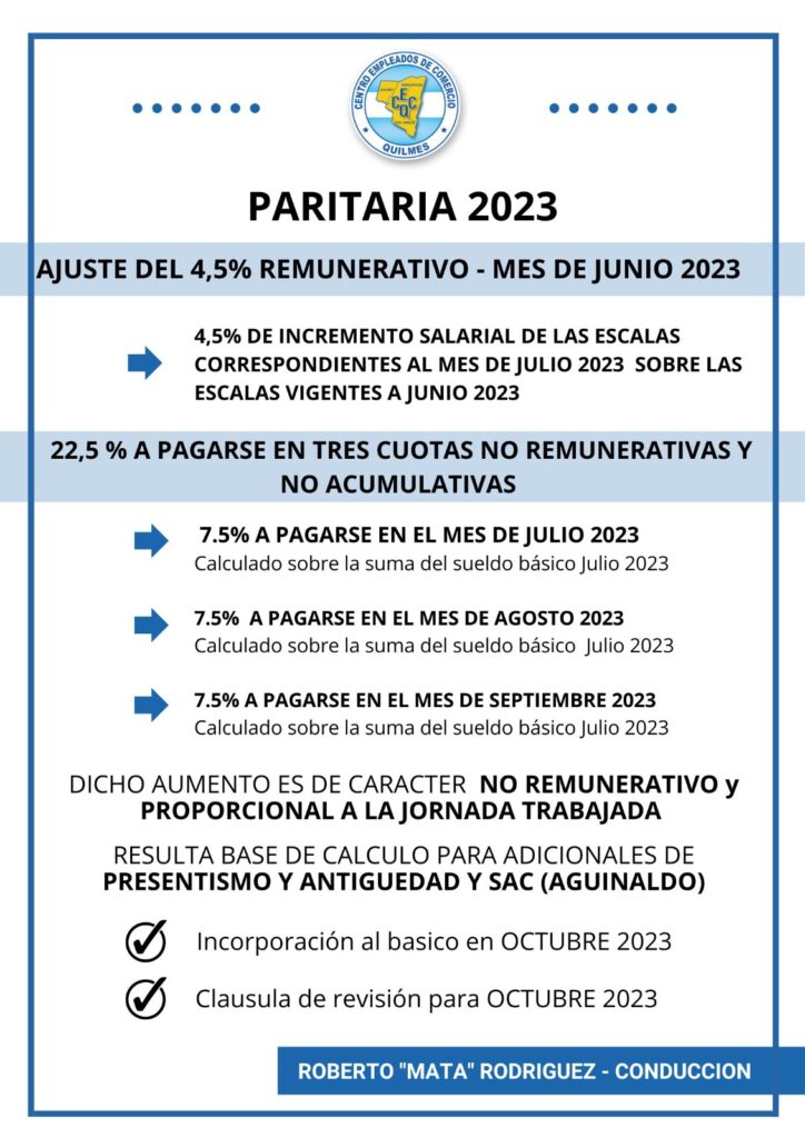 Se establecieron ajustes para junio e incremento salarial para julio en tres cuotas no remunerativas ni acumulativas hasta septiembre inclusive, incorporandose al sueldo básico en octubre.